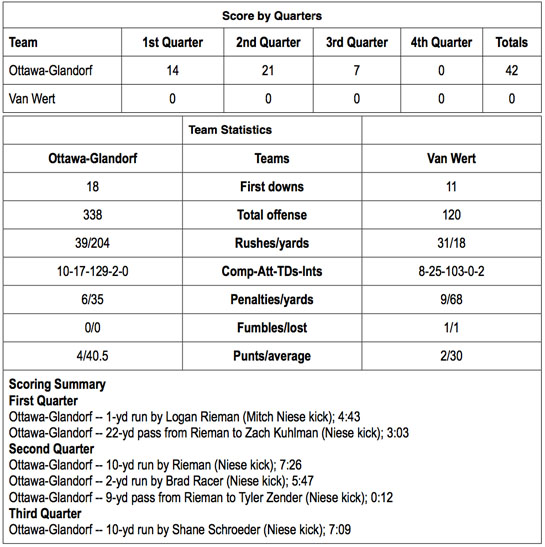 Ottawa-Glandorf scored three times in the second quarter. Rieman ran for the first TD from 10 yards out at the 7:20 mark, Brad Racer raced into the end zone from the Van Wert 2-yard-line with 5:47 remaining in the half, while Rieman hooked up with Tyler Zender on a 9-yard TD pass with 12 seconds remaining in the half for a 35-0 lead heading into the locker room.