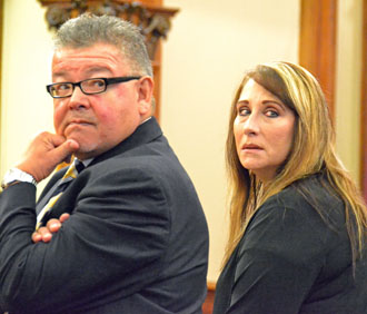 Tracy Vincent listens with her attorney, Joseph Benavidez, as her daughter gives a victim's statement during a hearing Wednesday in Van Wert County Common Pleas Court. (Dave Mosier/Van Wert independent)