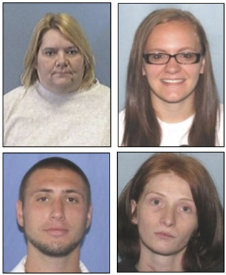 Delphos residents indicted on drug charges in Allen County Common Pleas Court include (top row, from the left) Candy Brooks and Melony Sunday; (bottom row) Phillip Cross and Nichole Keirns. (Delphos PD photos)