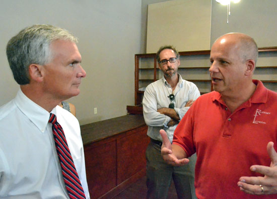 Redeemer Lutheran Church Pastor  Mike Saylor  (right) explains the Village Ministry Center concept to U.S. Representative Bob Latta (left) while County Commissioner Todd Wolfrum listens. (Dave Mosier/Van Wert independent)