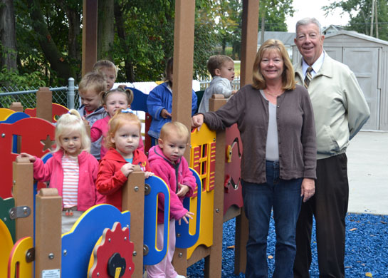 Wee Care Learning Center recently installed new toddler-sized playground equipment, thanks to a grant from The Van Wert County Foundation. The age-appropriate equipment, which was installed in August on a special colored mulch base, will provide years of enjoyment to youngsters at the center. Here, Wee Care Learning Center Director Faith Fabian and Van Wert County Foundation Executive Secretary Larry Wendel pose with some toddlers who are using the equipment. Wee Care is also a United Way member agency. (Dave Mosier/Van Wert independent)