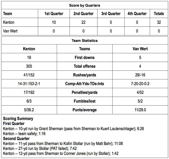The final touchdown of the game for Kenton came with 1:42 remaining in the second quarter when Sherman connected with Conner Jones on a 12-yard scoring strike. Stollar ran for the two-point conversion and the final score of 32-0.