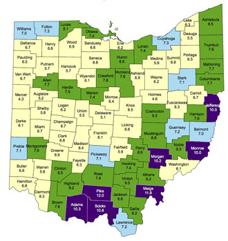 Pike County in southeastern Ohio had the highest unemployment rate at 12.0 percent, followed by Meigs (11.8 percent), Scioto (10.8 percent), Adams (10.3 percent), Morgan (10.2 percent), and Jefferson and Monroe counties, both at 10 percent even.