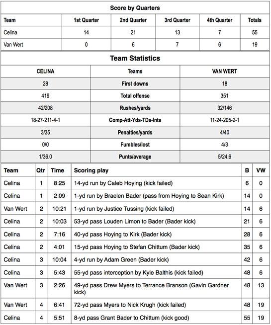 Celina scored twice more in the second quarter on a 40-yard pass from Hoying to Kirk at 7:16 and a 15-yard pass from Hoying to Stefan Chittum with 4:01 remaining in the first half. Bader kicked both extra points and the Bulldogs led 35-6 at the half.