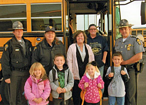 Posing with four Lincolnview kindergarten students are (back row, from the left) OSHP Trooper JJ McClain, Patrol Inspector Tina Eley, Lincolnview Elementary Principal Nita McKinney, bus driver Lucy Rice and VW Post Commander Lt. Les Brode. (OSHP photo)