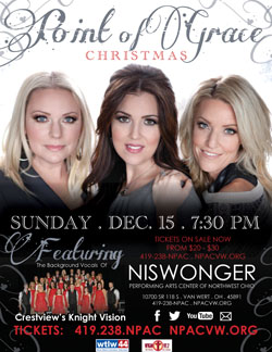 Knight Vision, the award-winning swing choir from Crestview High School, has been selected to back up Christian artists Point of Grace during their Christmas concert at the Niswonger Performing Arts Center in Van Wert. The concert will be held at 7:30 p.m. Sunday, December 15.