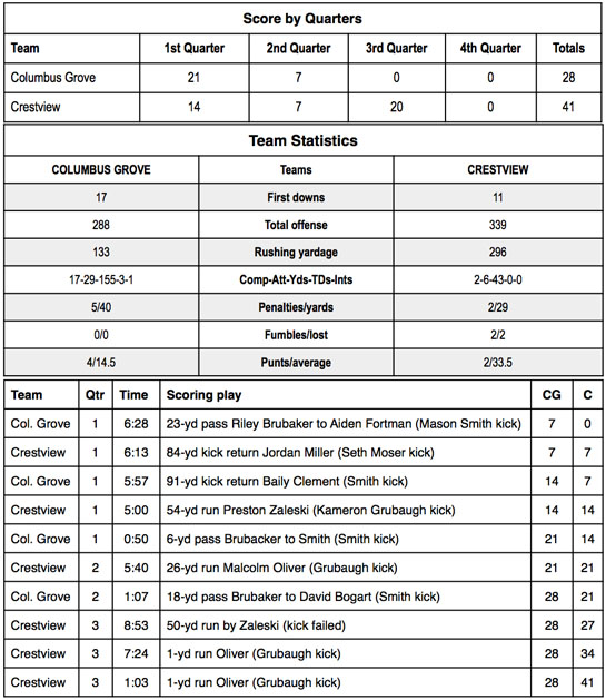 The third quarter was the key to the game, though, as the Knights scored three times, the first on a 50-yard run by Zaleski and the last two TDs on 1-yard runs by Oliver. Grubaugh kicked two of three extra-point tries and Crestview won 41-28.