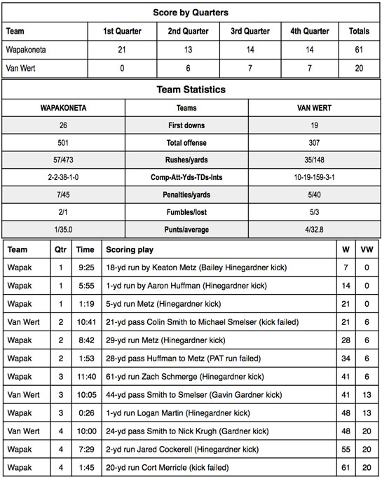 Van Wert again responded with a 24-yard scoring strike from Smith to Nick Krugh with 10 minutes even remaining in the game; however, Wapak scored the final two touchdowns, the first on a 24-yard run by Jared Cockerell and the second coming with Cort Merricle ran to paydirt from the Cougars’ 20-yard line with just 1:45 left in the game.