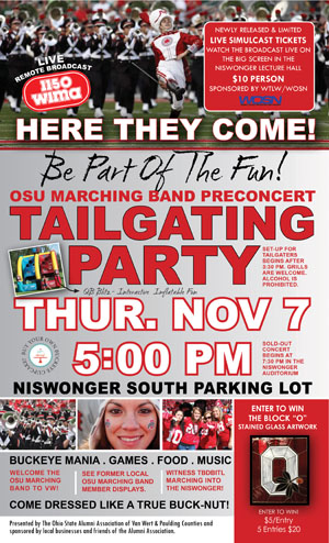 Tailgating makes any Ohio State event complete. The Ohio State Marching Band concert is no exception. A tailgating party being held from 5-6:45 p.m. in the south Niswonger parking lot is open to all who are interested in being part of the festivities. The family fun features food sales from local businesses, including a special Buckeye cupcake from Cakecrazy and the classic hot dog from Dougie Dogs. Tailgating music and games, interactive inflatables, and 1150 WIMA will be on-site with a live remote. Raffle tickets will be available in the Niswonger lobby to win the stunning stained glass Block “O” artwork crafted by artisan Dave Taylor. The winner will be announced during intermission of the concert.