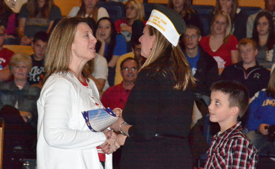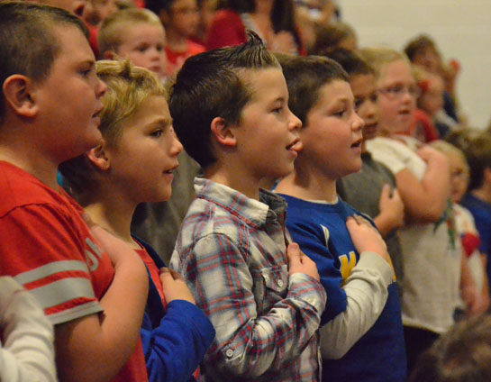 Lincolnview Local Schools held a Veterans Day assembly on Friday to honor local military veterans. Above veteran Colleen Wiley (in hat) receives a certificate honoring her service, while (below) third graders sing “The Star-Spangled Banner” to start off the assembly. (photos by Dave Mosier/Van Wert independent)