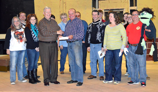 Larry Wendel, retired executive secretary of The Van Wert County Foundation, is shown presenting a grant of $2,000 to the Van Wert Civic Theatre. Accepting the grant is Jerry Zimmerman, director of VWCT’s current production, Avenue Q, along with members of the cast. Theatre board members thanked the foundation for its support of, not only that organization, but the entire community. (VWCT photo)