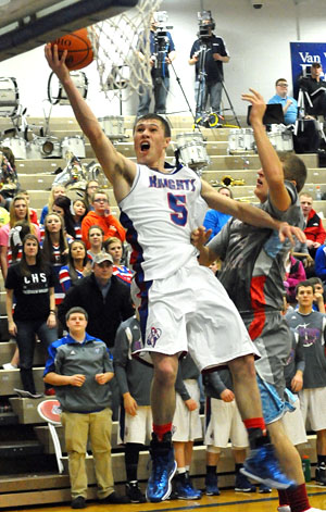 Crestview's Cam Etzler (11) goes way up for a layup in Friday's game against Lima Central Catholic. The Knights won the game, 66-54. (Jan Dunlap/Van Wert independent)