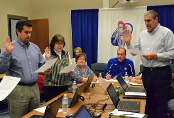 Crestview Local Board of Education members (from the left) Wes Skelton (new), Lori Bittner and Lonnie Nedderman are sworn into to a new term of office. (Dave Mosier/Van Wert independent)
