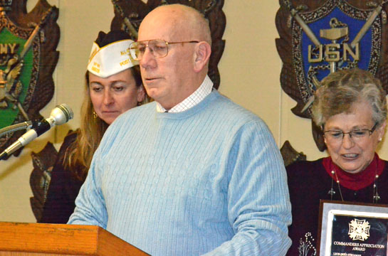 Veterans of Foreign Wars Post 5803 had its annual dinner and awards ceremony on Saturday at the post home on North Shannon Street. Above, Dave Freeman, winner with his wife, Karen (right), of the annual award designated by Commander Colleen Wiley (left), speaks briefly at the dinner. Firefighter Mike Eversole was “Firefighter of the Year” while Officer Greg Blackmore was “Police Officer of the Year.” Local winners of the Patriot Pen and Voice of Democracy contests were also named (see more photos and a story in Wednesday’s independent). (Dave Mosier/Van Wert independent)