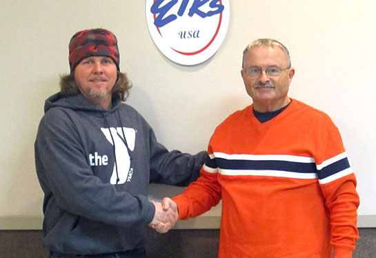 Elks Lodge 1197 in Van Wert will be sponsoring a $1 day at the Camp Clay Aqua Park this year. Local businesses purchase the day for the Van Wert community, and access includes swimming, a floating playground, zip-line, paddleboats, and a half-acre beach. To learn more, visit the YMCA website at www.vwymca.org. Shown here are Mike Stanley of the local Elks Lodge and Clint Myers, YMCA Camp Clay Aqua Park director. (YMCA photo)