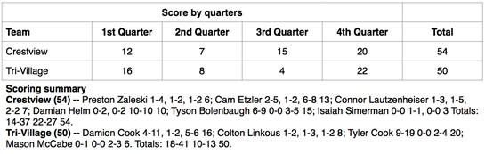 The rebounding edge went to Tri-Village, which brought down 29 boards to 23 for the Knights, while Crestview had fewer turnovers, 9-15, than the Patriots.