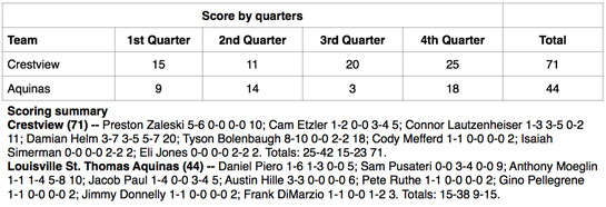 The local Knights outrebounded Aquinas 28 to 21, while Crestview also had fewer turnovers, 19-22, than Aquinas.