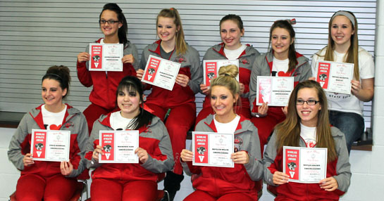 Six cheerleaders were awarded with their varsity letters. The third-year letter winner was senior Grace Hammons. Second-year varsity letter winners included juniors Lauren Eikenbary and Liz Keirns. First-year letter winners included junior Maekenzie Alba, sophomore Katelyn Welch and freshman Hannah Mengerink.Tiffany Ricketts was presented a Varsity letter for participating as the Winter Sports Mascot.