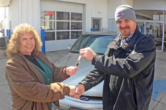 It took nearly a month, but all four wheels of a Chevrolet Lumina placed on a 5-foot snow bank in front of Lee Kinstle’s GM Sales & Service’s showroom, 650 W. Ervin Road in Van Wert, finally touched solid ground. The car was placed on the snow in late February and area residents asked to submit guesses on what day all four wheels would again touch the ground. Five people guessed the correct date – March 21 – and the winner of the car, Sandy Klinger of Convoy, was drawn by a customer waiting in Kinstle’s Service Department. Here, Klinger receives the keys to the Lumina from Kinstle salesman Jason High on Monday. Lee Kinstle’s can be found online at www.leekinstle.com, on Facebook at www.facebook.com/leekinstle and Twitter @LeeKinstleGM. (photo submitted)