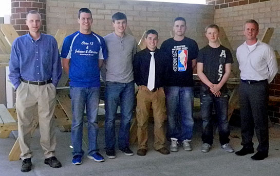 The Lincolnview Industrial Technology Club officers recently presented six picnic tables the club made for the Middle Point Ballpark Association to Association Board member Kevin Price. Shown are (from the left) instructor Jay Hoersten, Jacob Pollock, Hayden Ludwig, Dalton Kayser, Tyler Richey, Jalen Robert and Price. (submitted photo)