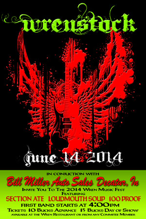 Presale tickets will be $10 and are available now at the Wren Restaurant, Bill Miller’s Auto Sales in Decatur, and from any Wiffleball Committee member. Tickets are $15 the day of the show. WrenStock is open to all ages, but participants will need a ticket to enter. Those planning to enter the beverage garden will be given a wristband – with proper ID. No carry-in beverages of any kind and no pets are permitted. Food concessions will be available. Bring own lawn chairs for event seating.