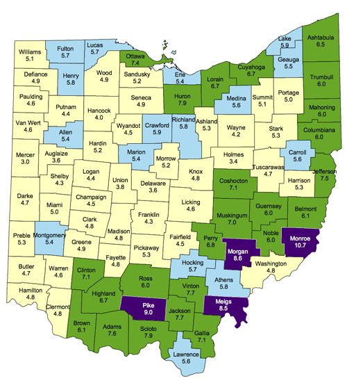 In the meantime, some major improvements were seen at the high end of the unemployment scale. Only four counties had unemployment rates above 8.0 percent in April, with only one of those (Monroe County, 10.7 percent) exceeding 10 percent. The others with unemployment rates above 8.0 percent include Pike County (9.0 percent), Morgan County (8.6 percent) and Meigs County (8.5 percent).