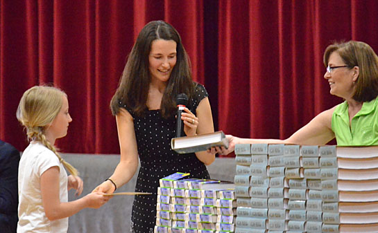 The Cross Over the Hill bible education program for the Van Wert City Schools held its fifth grade graduation ceremonies Thursday evening in the S.F. Goedde Building gymnasium. Cross Over the Hill Board President Shaun Putman spoke, while local magician Tyler Nygren was guest speaker and also entertained the fifth-graders and their parents. Above, teachers Sarah Hostetler (left) and Caralee Campbell distribute diplomas and Bibles to fifth-graders. (Dave Mosier/Van Wert independent)