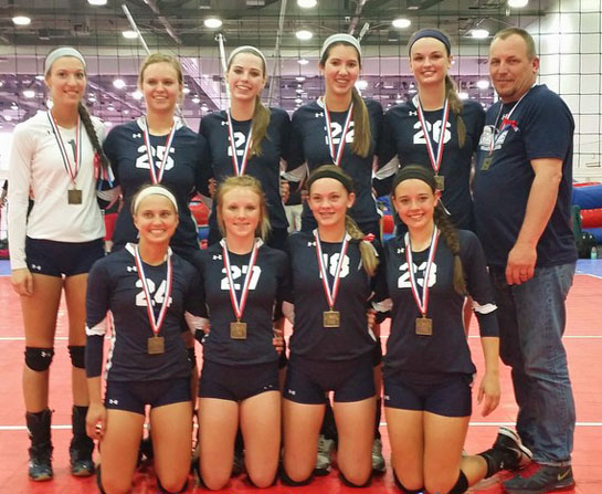 The Ohio Valley Region, a division of USA Volleyball, consists of club teams from Ohio, western Pennsylvania, and West Virginia. The club season begins in January and finishes with championship competition in May at the Columbus Convention Center. The Grandlake Volleyball Club Team Invasion, won the 16 Regional Division, finishing first out of the 116 teams competing in that division. Shown are (kneeling, from the left) Makenna Brackman of New Bremen, Brianna Schulte of Celina, Allison Angstman and Natalie Kuenning, both of St. Marys; (standing) Tianna Rager and Halen Helm of Crestview, Camaryn Dzendzel and Patricia Dennis, both of Celina, Erika Angstman of St. Marys and Coach Hardesty. Other top finishers from the Grandlake Volleyball Club include Jeanette Etzler’s 12R team (second of 108 teams), Mary Lou Bruns 13R team (ninth of 140 teams), Michelle Hardesty’s 14R team (third of 170 teams), and Miranda Strous’ 14R team (fifth of 170 teams). (photo submitted)
