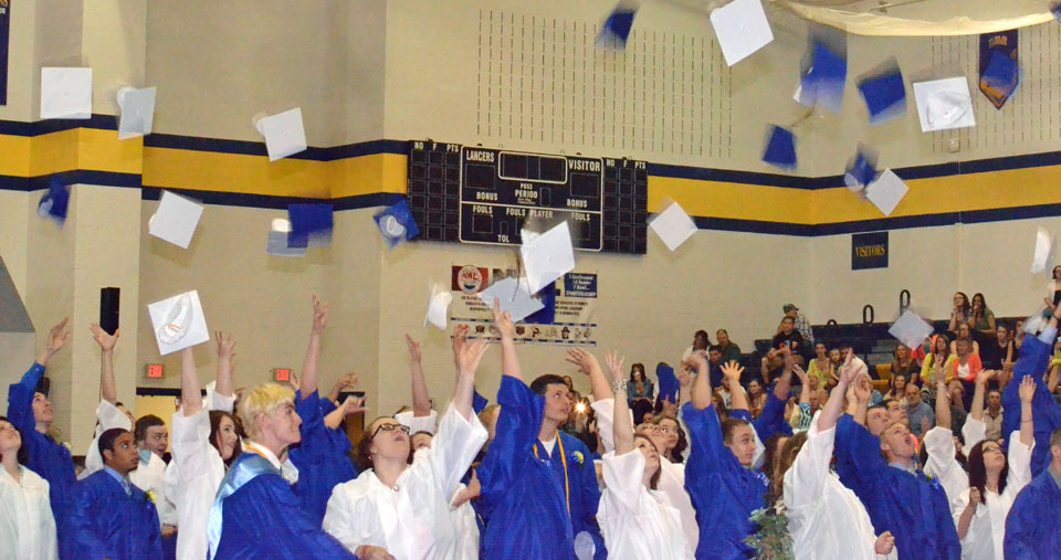 Lincolnview High School held graduation ceremonies for the Class of 2014 on Sunday afternoon in the high school gymnasium. A total of 62 seniors received diplomas on Sunday from members of the Lincolnview Local Board of Education. Here, seniors toss their mortarboards at the end of the commencement exercises. More photos and a story will appear in Tuesday’s edition of The Van Wert independent. (Dave Mosier/Van Wert independent)