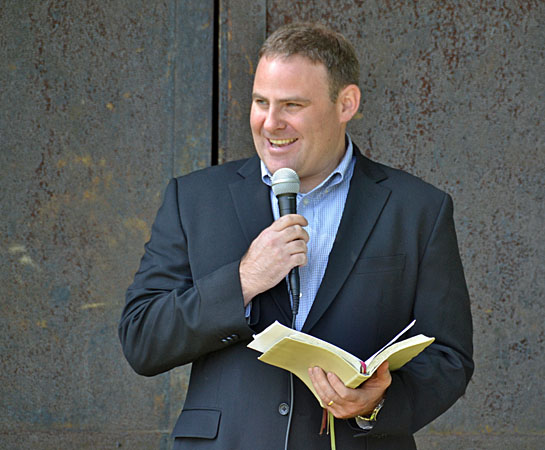Several Van Wert County communities held Memorial Day services on Monday. At top, Pastor Dave Schutter, a veteran himself, speaks during Van Wert’s Memorial Day ceremony at Woodland Cemetery, while wreaths (bottom) are laid at the veterans’ memorial at the cemetery (more photos on Wednesday). (photos by Dave Mosier/Van Wert independent)