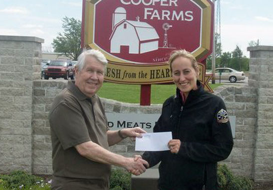 Kacy Wagner, human resource manager for Cooper Farms, presents a $1,500 check from the Cooper Family Foundation to Joe Steffan, past president of the Van Wert County Historical Society. The grant will be used to restore the last free standing tourist cabin on the Lincoln Highway in Van Wert County. Alexander & Bebout Inc. moved the tourist cabin to the historical museum site. (Historical Society photo)