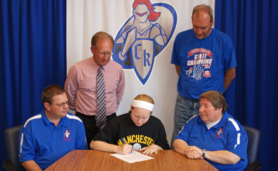 Crestview’s Courtney Grote recently signed a letter of intent to play softball at Manchester University.  Grote is a 2014 graduate of Crestview High School, where she lettered in soccer, basketball and softball.  Shown (seated) is Grote, with her parents, Kevin and Deb, along with Crestview softball coach Carl Etzler (standing left) and Crestview Athletic Administrator Dave Bowen. (Crestview photo)