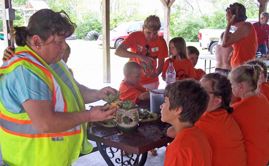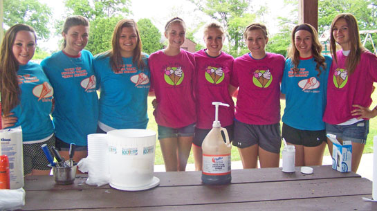Community Health Professionals’ Hospice held its annual Rays of Hope Camp June 17-19 at Van Wert County YMCA’s Camp Clay and LifeHouse Church. Rocky Top Ice Cream provided refreshment for campers and staff. Crew members (above, from the left) Alexandria Bartley, Reed Wermer, Melissa Bona, Natalie Riethman, Megan Barnhart, Katie Trittschuh, Kelsey Dotson, and Morgan Magowan came out to serve ice cream to camp participants, while Robin Kraner (below) of Stoneco Quarry helped kids make dinosaur and animal planters and sand bracelets. The day camp helps kids who have experienced the loss of a loved one. (CHP photos)