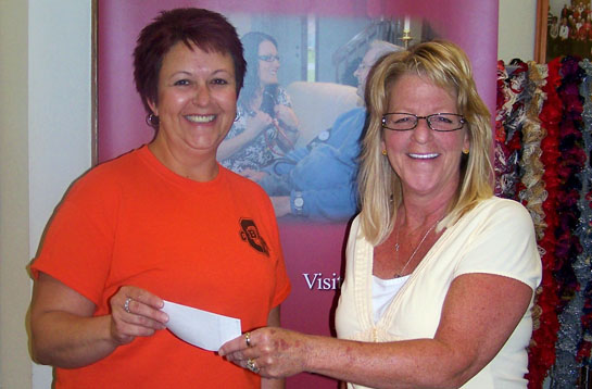 The Century Bar held its fourth annual Poker Run to benefit Community Health Professionals Hospice on June 21. A total of 56 bikes and 80 riders participated, raising $1,265 for the Van Wert Hospice Patient Care Fund. Here, Wendy Ketcham of the C-Bar (left) presents a check to Robin Waters of CHP. Sponsors included Tony Krick, Elmco Engineering, Emme Lu’s, Brewed Expressions, Partee Shop, Open Minded, Eberle Photography, Van Wert County Fair, Olympic Lanes, TNT Tattoos, KTR, Emily at Impressions Salon, Tracy’s Country Flea Market and Northwest Ohio Welch Trophy. (CHP photo)
