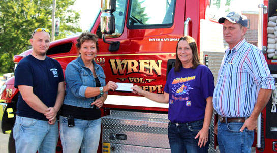 Wren Fire & EMS Department, on behalf of all Van Wert County fire departments, thanks the Van Wert Community Club for its generous donation of $100 to the “No Child Sleeps Unprotected” fund. It’s donations such as this that will help firefighters reach their goal of providing free smoke detectors, with a special 10-year battery, to provide protection for county youngsters in the event of a house fire. Anyone wanting to make a donation of any size – individuals or businesses alike – may take it to any Van Wert County Fire Department or mail donations to the Van Wert County Convention & Visitors Bureau with a designation for the funds to go for the smoke detector project. Here, Wren Fire Chief Jackie Brandt (second from left) accepts a check from club members. (photo by Beth Marchek)