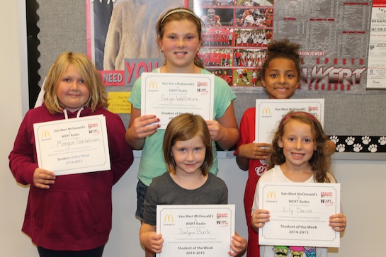 Congratulations to the Van Wert Elementary Students of the Week! These students represent the Word of the Week, Kindness: Morgan, Grade 5; Saige, Grade 4; Macy, Grade 3; Jaelynn, Grade 1; and Lillian, Grade 2. Each student received a free Mighty Kids Meal from our local McDonald’s and a certificate from WERT Radio. (Photo submitted.)