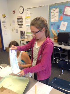 The 6th grade has been busy doing scientific experiments. Student Madysen Glossett commented, “When we are doing experiments, we learn about how things change and work using the scientific method! Our class gathered data and our supplies. With the dripping diapers, we can watch as the water is soaking into the diaper. We also saw what was inside the diaper. We could make observations but could not taste the chemical absorbent because we practiced science safety. Most importantly we did the experiment and answered the question, which was how many milliliters of water can a diaper hold? With the Come Fly with Me experiment we made paper airplanes the same way, and we threw the airplanes to see how far they would go. Then we calculated the average. By doing these experiments, we can show how we used the scientific method.”