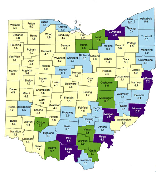 Monroe County in the Appalachia area of Ohio had the highest unemployment rate at 10.7 percent, while six other counties had jobless rates at or above 7.0 percent. They include Meigs County (8.1 percent), Pike County (7.8 percent), Scioto County (7.6 percent), Jefferson and Morgan counties (7.2 percent), and Cuyahoga County (7.0 percent).