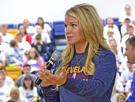 People get excited about technology? In addition to Apple retail stores this time of the year, Lincolnview students and staff were celebrating Tuesday the distribution of new desktop, laptop and tablet computers as part of the district’s 1:1 computer initiative. Funds for the technology purchases came from a $450,000 Straight A Fund grant, as well as district funding. A total of 630 Google Chromebooks, 100 Lenovo LearnPads, 35 iMac desktop computers, 40 Dell laptops, 30 Sanyo document cameras, as well as carts, Smart Boards, and related software (see a sampling below). Lincolnview Superintendent Jeff Snyder spoke during the event, as did Van Wert native Allie Clifton Kaslow (above), a Fox Sports Ohio sidelines reporter for the Cleveland Cavaliers who gave a motivational speech to the students. On hand were State Senator Cliff Hites, State Representative Tony Burkley and Lincolnview grad and Van Wert County Commissioner Todd Wolfrum. (photos by Dave Mosier/Van Wert independent)
