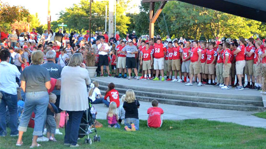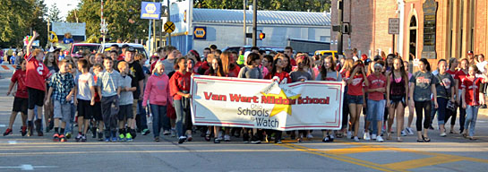 Van Wert High School held its pre-Homecoming activities on Wednesday evening. A Homecoming Parade (above) marched from St. Mark’s Lutheran Church down Jefferson Street to Fountain Park, where a pep rally (below) was held.(photos by Jan Dunlap/Van Wert independent)
