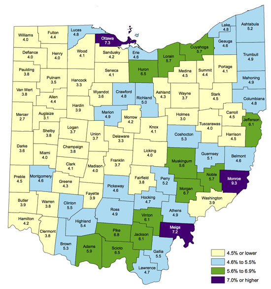 On the other end of the spectrum, no Ohio counties had unemployment rates above 10 percent, and only three counties’ jobless rate was above 7 percent in November. Those include Monroe County (9.3 percent), Ottawa County (7.3 percent) and Meigs County (7.2 percent).
