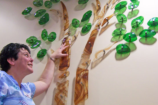 Tonya Schumm, RN, nursing supervisor, looks at the memorial tree in the lobby at the Van Wert Area Inpatient Hospice Center. Leaf spaces, engraved with names in memory or honor of loved ones, which were offered since the hospice center opened five years ago, are now all filled. Window Creations LLC of Ottoville created the dimensional glass wall art design. Engraved memorial brick pavers are still available for the path leading to the center entrance. More information about memorial bricks is at www.ComHealthPro.org on the online donation page. (CHP photo)