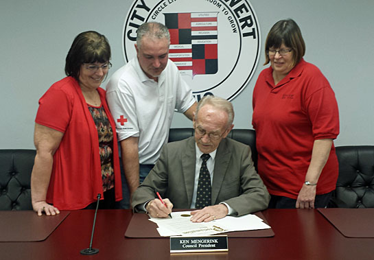 Van Wert Mayor Don Farmer signs a proclamation designating March as “Red Cross Month” as local Red Cross officials look on. (submitted photo)