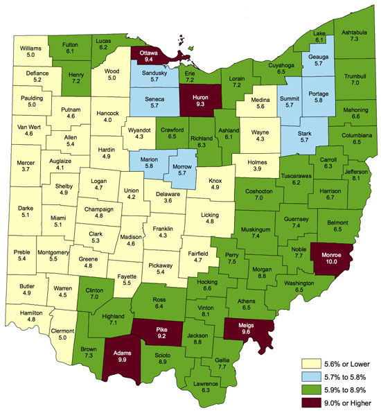 At the high end of the scale, six counties had unemployment rates higher than 9.0 percent. They include Monroe County (10.0 percent), Adams County (9.9 percent), Meigs County (9.6 percent), Ottawa County (9.4 percent), Huron County (9.3 percent), and Pike County (9.2 percent). Ohio’s adjusted unemployment rate for February is 5.6 percent.