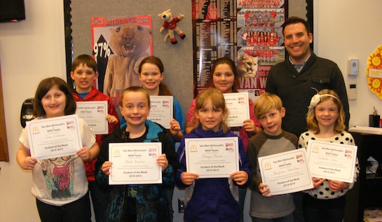 Congratulations to the Van Wert Elementary Students of the Week! Pictured with Justin Krogman, Assistant Principal, are students chosen by their teachers for being determined: Marley, Grade 5; Zoe, Grade 3; Meagan, Grade 2; and Benjimen, Grade 1. Also in this photo are students chosen by their teachers for being dedicated: Jaiden, Grade 5; Katie, Grade 4; Noah, Grade 2; and Bella, Grade 1. Each student received a free Mighty Kids Meal from our local McDonalds and a certificate from WERT Radio. (Photo submitted.) Not pictured are Isabella, Grade 4 (selected for being determined); and Payton, Grade 3 (pictured for being dedicated). (Photo submitted.)