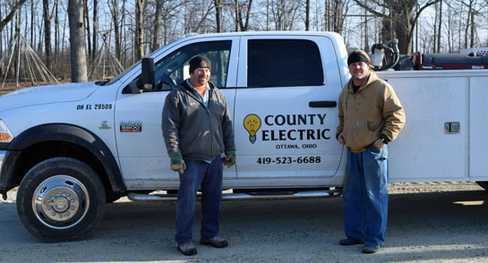 The YMCA Camp Clay splash pad project received a donation of $1,000 from County Electric in Ottawa. The new 3,600-square-foot splash pad will open Memorial Day weekend. Shown are (from the left) Buck Rosengarten, job foreman for County Electric, and Camp Clay Director Clint Myers. (YMCA photo)