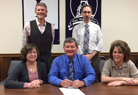 Van Wert County Commissioners Stan D. Owens (seated center), Todd Wolfrum (standing right) and Thad Lichtensteiger present a proclamation to 9-1-1 Director Kim Brandt (seated left) and Van Wert Police Department Dispatcher Shelly Smith in honor of dispatchers working in Van Wert County. April 12-18 is National Public Safety Telecommunicators Week. (photo submitted)