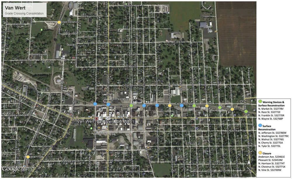 According to a plan outlined by Mayor Don Farmer during a special meeting of Van Wert City Council on Monday, railroad crossings on North Washington, North Jefferson, North Tyler, North Cherry and North Walnut streets will undergo reconstruction, while crossings at North Market, North Race, North Franklin and North Wayne streets will be reconstructed and also receive new warning lights and crossing gates.
