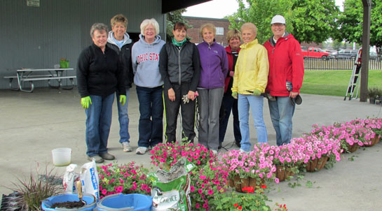 Members of the Evergreen Garden Club once again descended on downtown Van Wert’s Fountain Park to plant the annual planters and hanging baskets for the enjoyment of visitors to the park during the upcoming summer season. This is one of the club’s projects to plant and maintain the flowers in Fountain Park. Each member is responsible to check the water system and pull weeds for one week during the summer days. This year’s chairwoman is Linda Mechling, who coordinates the civic beautification project at the park. Shown are club members (from the left) Leslie Simon, Paula Stemen, Janet Smith, Diane Ryan, Linda Mechling, Linda Morris, Marsha Morton and Kathy Muse with some of the flowers to be planted. (photo submitted)