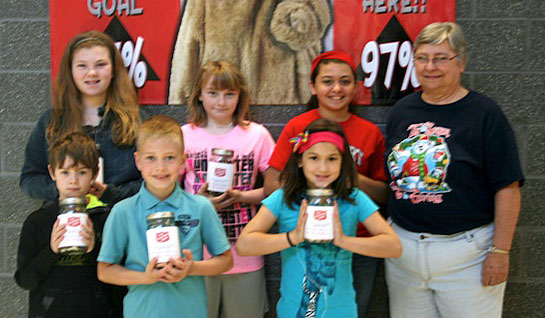 The Van Wert Salvation Army Capital Campaign moved closer to its goal with the generous support of county students, as April became Salvation Army Month in the public schools. Coins were collected in quart jars. When the counting was completed, the public schools donated a total of $6,006. The Salvation Army genuinely appreciates the Van Wert City Schools and their donation of $2,640 (high school $1,457, middle school $229, and elementary $954). Shown are representatives of Van Wert Elementary School, Van Wert Middle School and Van Wert High School, along with some of the donations, and Rita Hurless, Salvation Army board member. (Salvation Army photo)